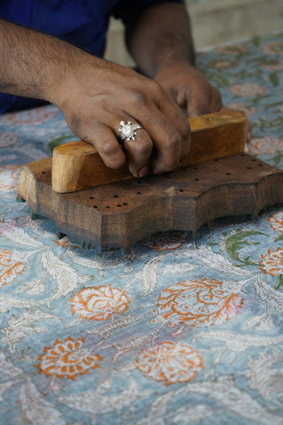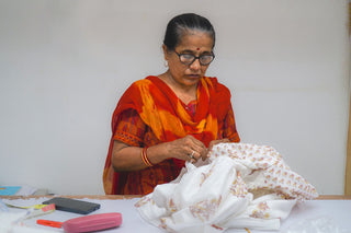 After hand blocking is complete, each piece is further embellished with intricate hand-smocking embroidery. The embroidery has been beautifully executed by a group of women artisans.
