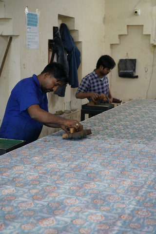 Rahul, another one of our karigars, works alongside Anil. At the age of 30, he also has a decade of experience. Rahul learned the art of hand blocking from his father’s older brother when he was 20 years old and hasn’t looked back since. When asked, Rahul said he loves what he does because it stimulates him creatively. He has two children who often sit beside him as he scrupulously aligns every block to the fabric.