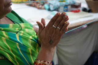 Radha, another one of our artisans, is currently teaching embroidery to her three daughters. She spends hours on each product, meticulously carrying out every intricate stitch while also explaining the hows and whys behind it. Her patience never dwindles. Neither does her concentration.